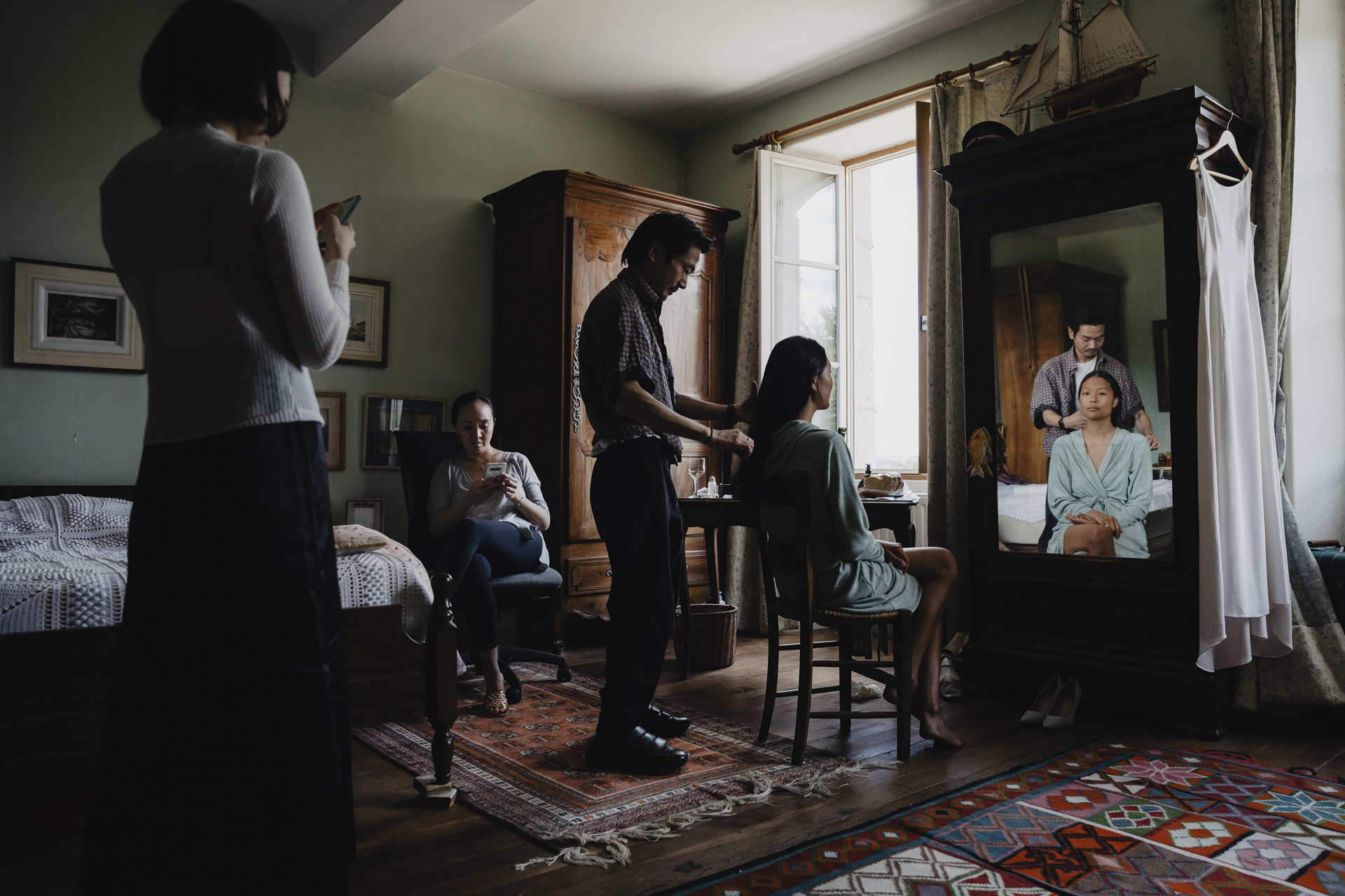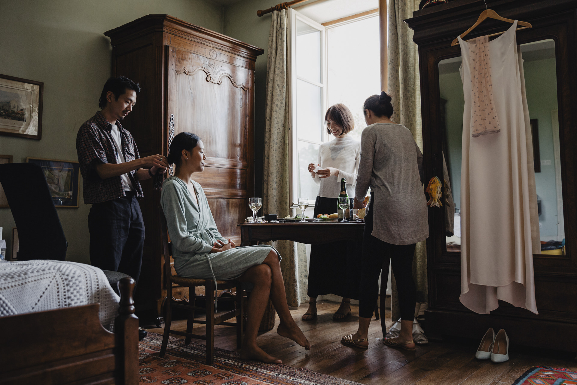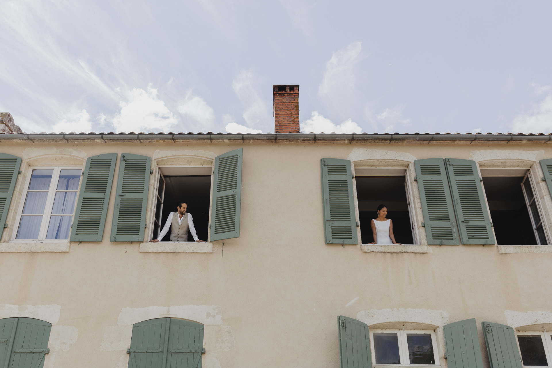 Derrière ces volets verts olive, se prépare deux amoureux aux cultures différentes. Ce mariage m’a beaucoup touché, par son authenticité, et les émotions qui se sont dégagées tout au long de la journée. Ce mariage franco-asiatique est une célébration unique, fusionnant deux cultures riches en traditions et en symbolisme. Imaginez une journée où l’élégance occidentale rencontre la splendeur orientale, créant un mélange harmonieux de coutumes et de festivités.