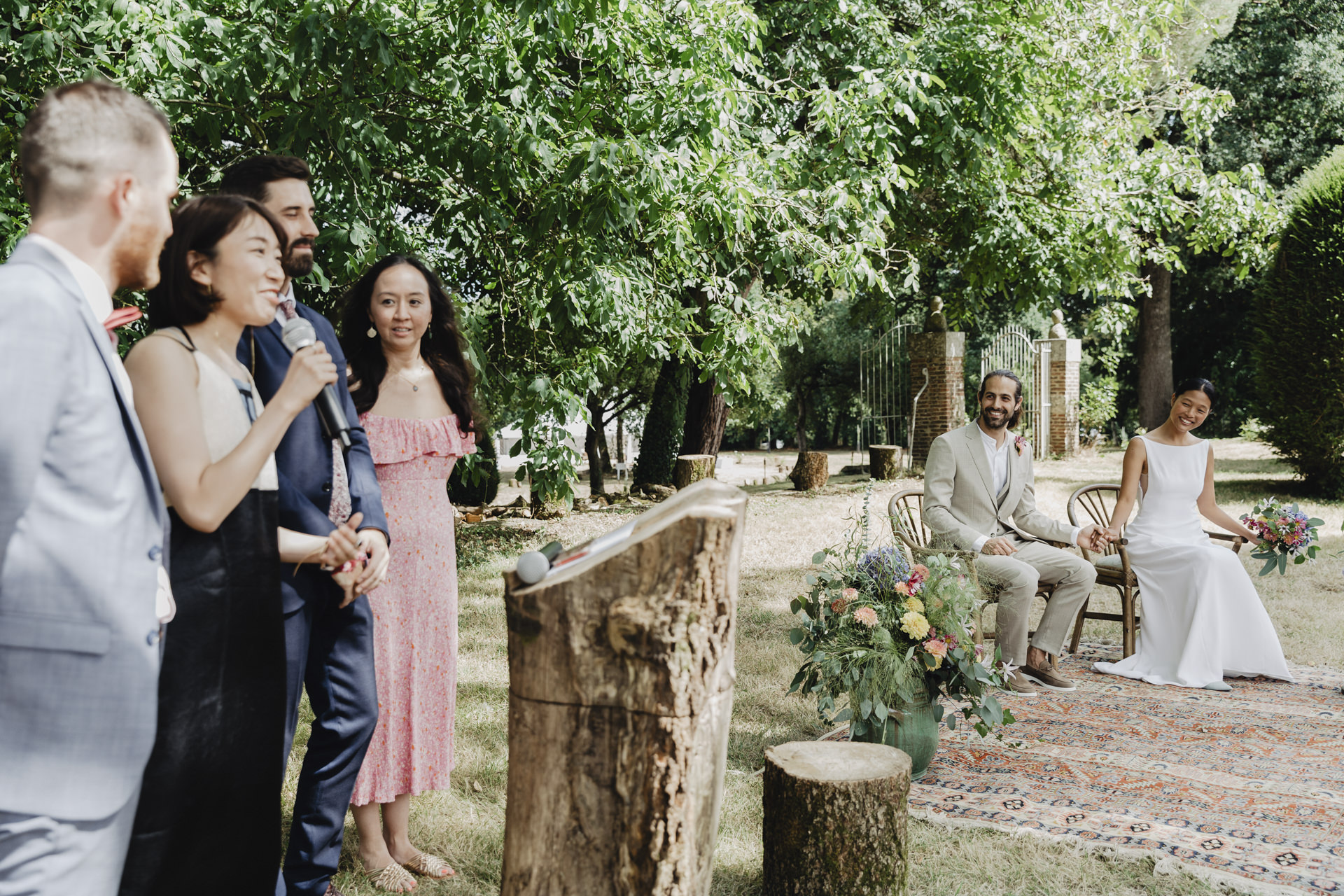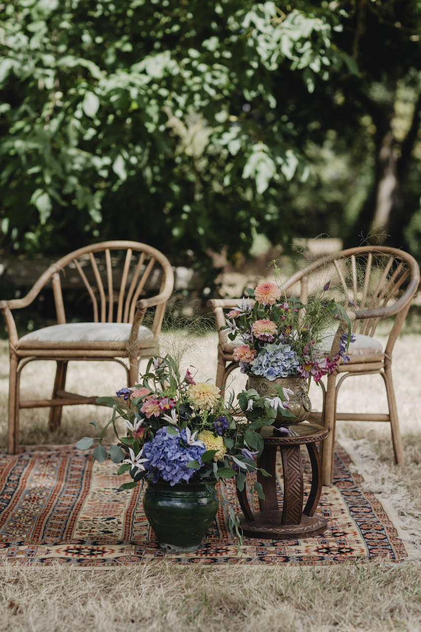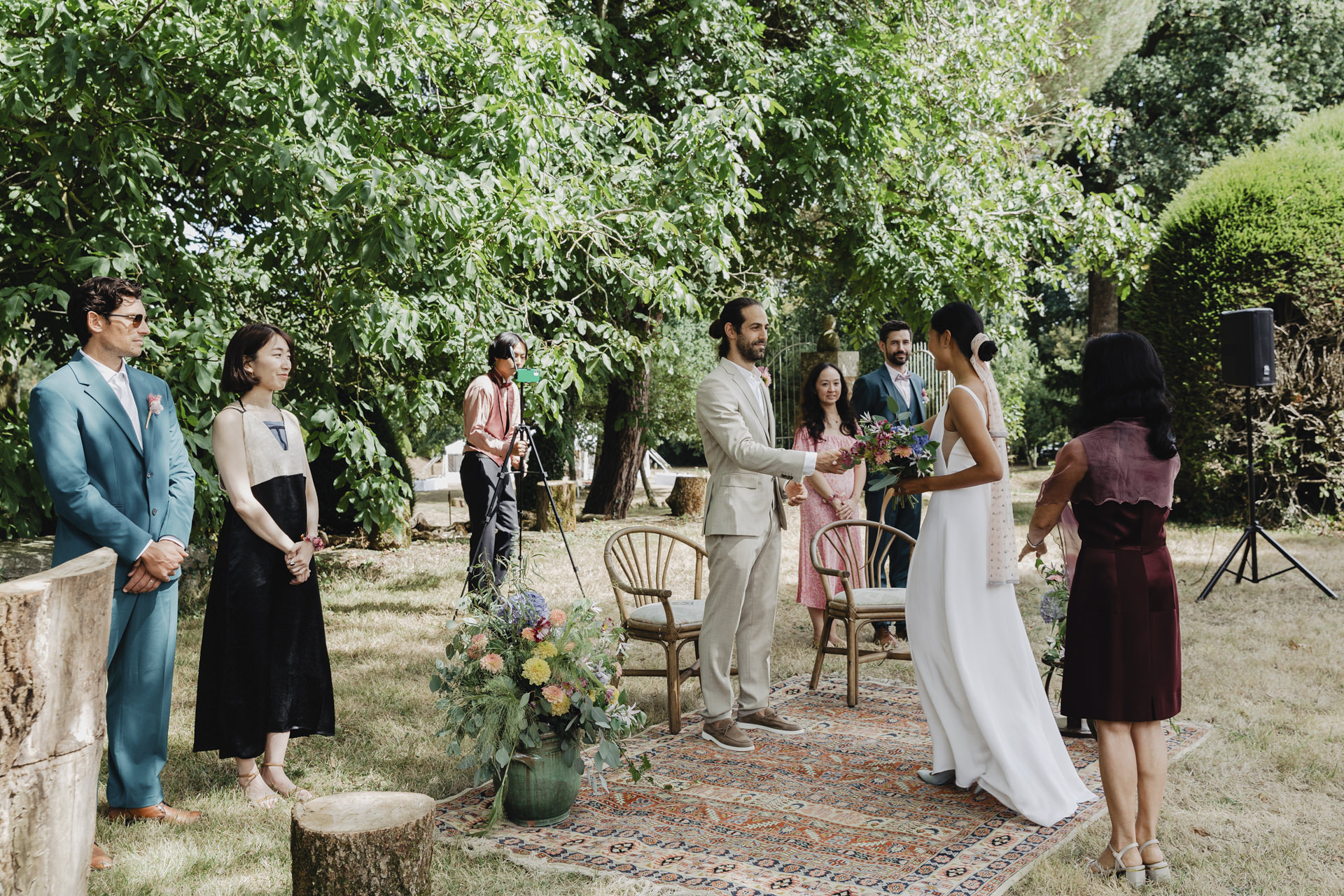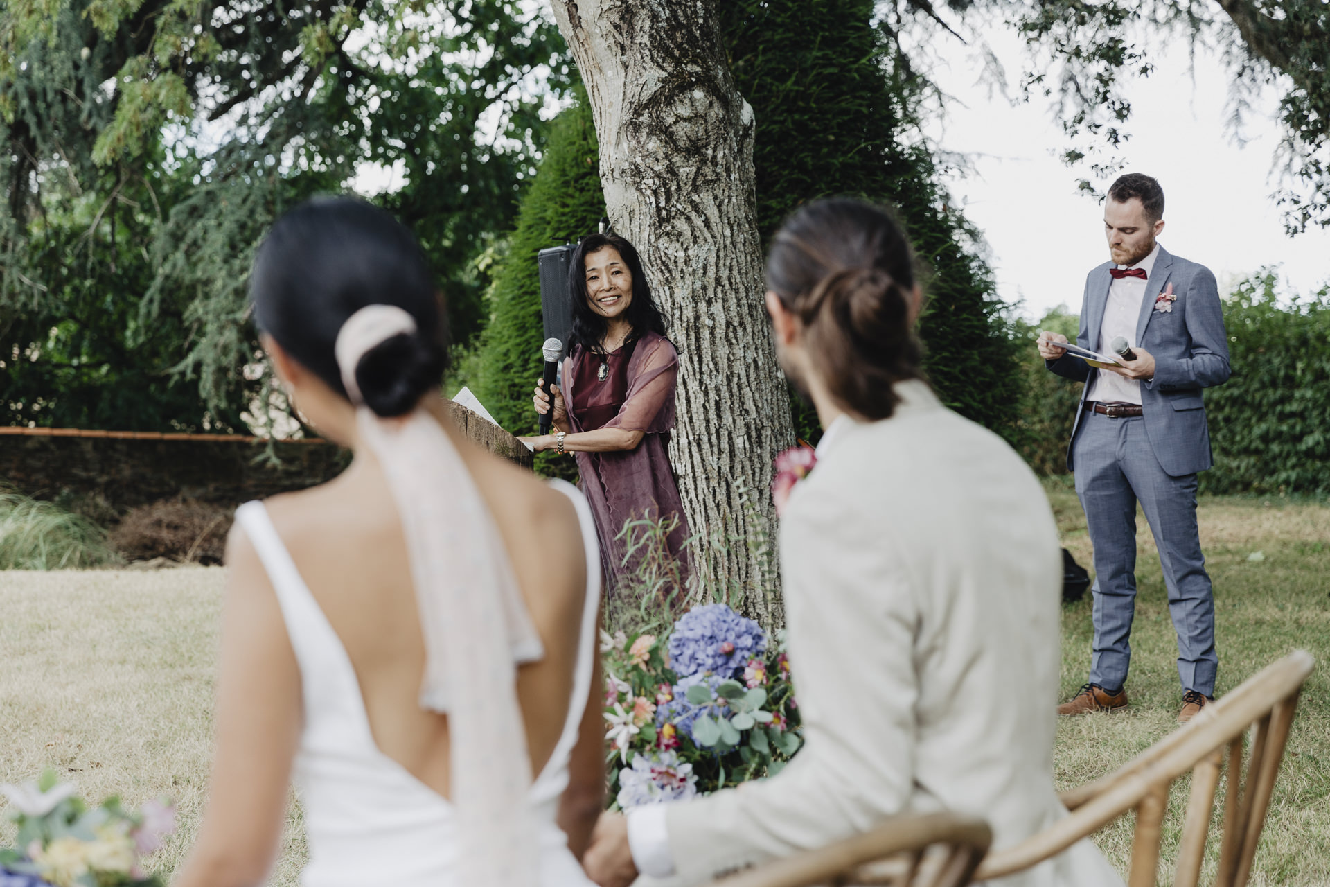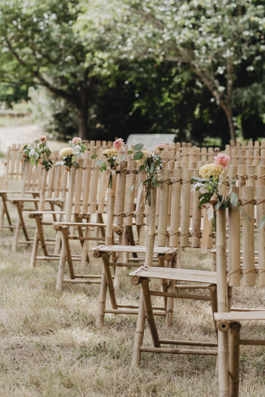 Au fond du jardin, sous un élégant chapiteau décoré de guirlandes, de fleurs et d’origamis personnalisés , des petits mains préparent les festivités du soir. Non loin de là, les invités se rassemblent avec des sourires éclatants. Des chaises en bambou alignées soigneusement, chacune ornée de petits bouquets de fleurs fraîches, offrent une vue parfaite sur l’autel improvisé.