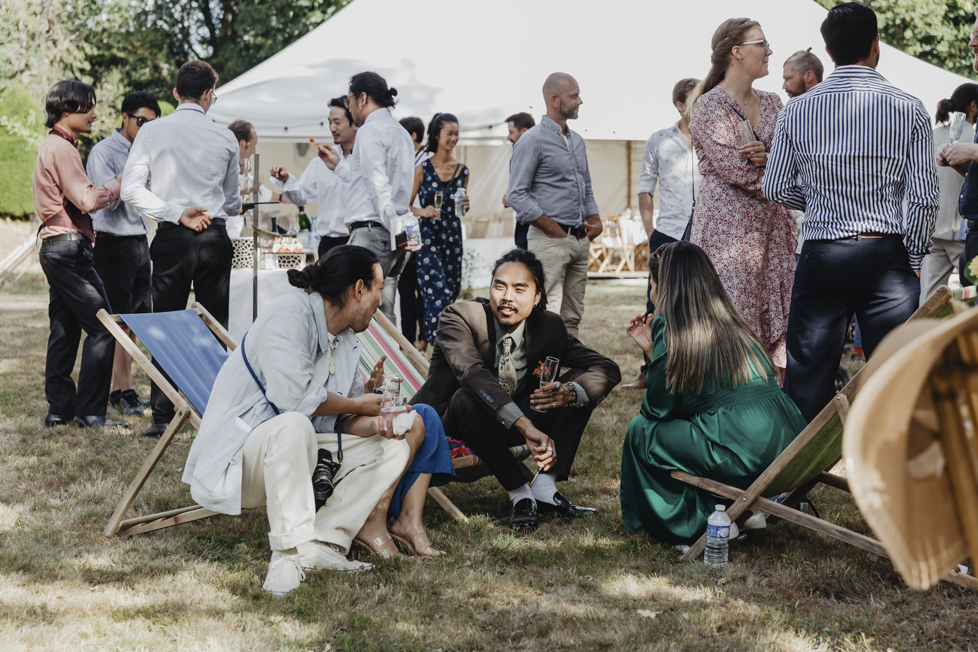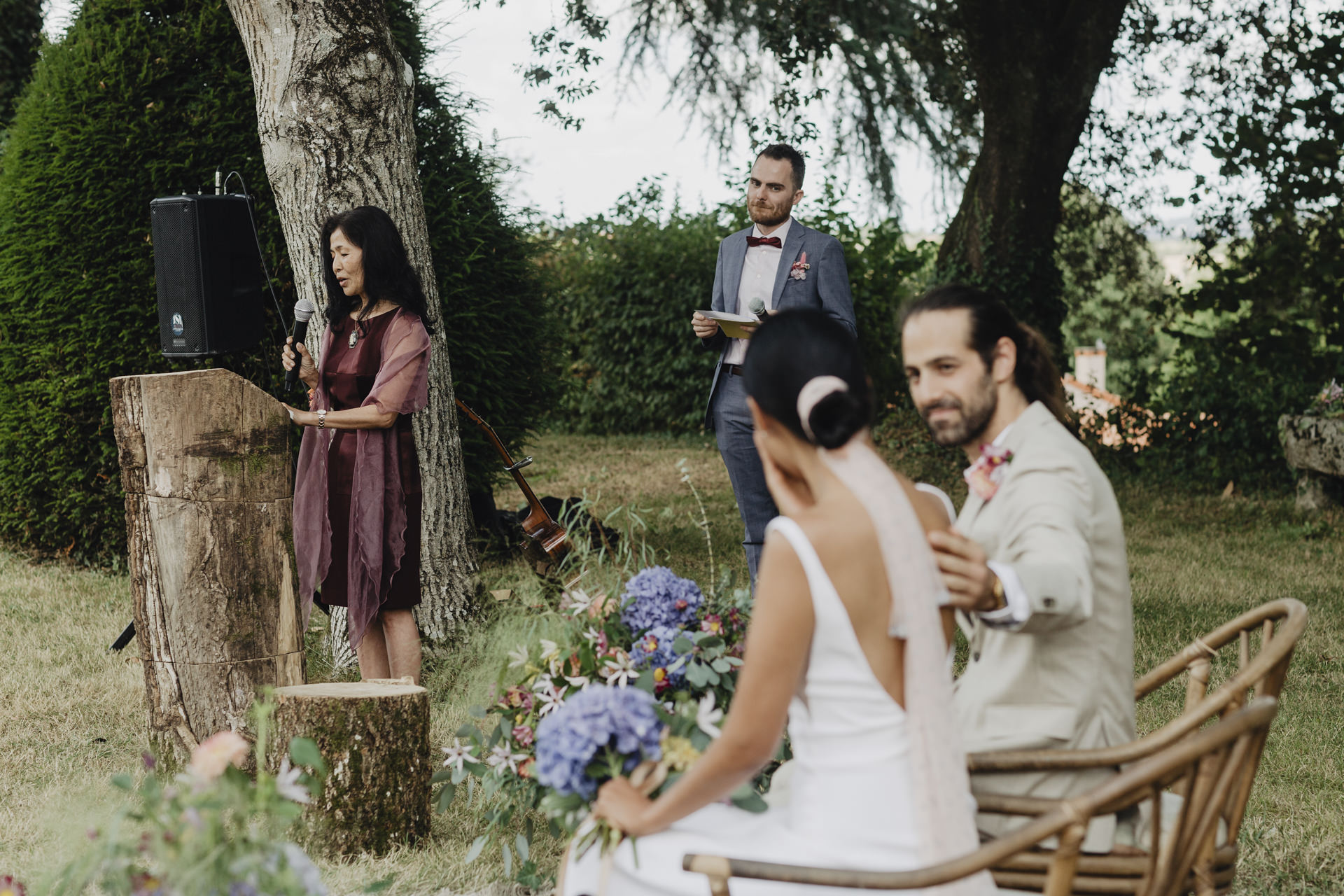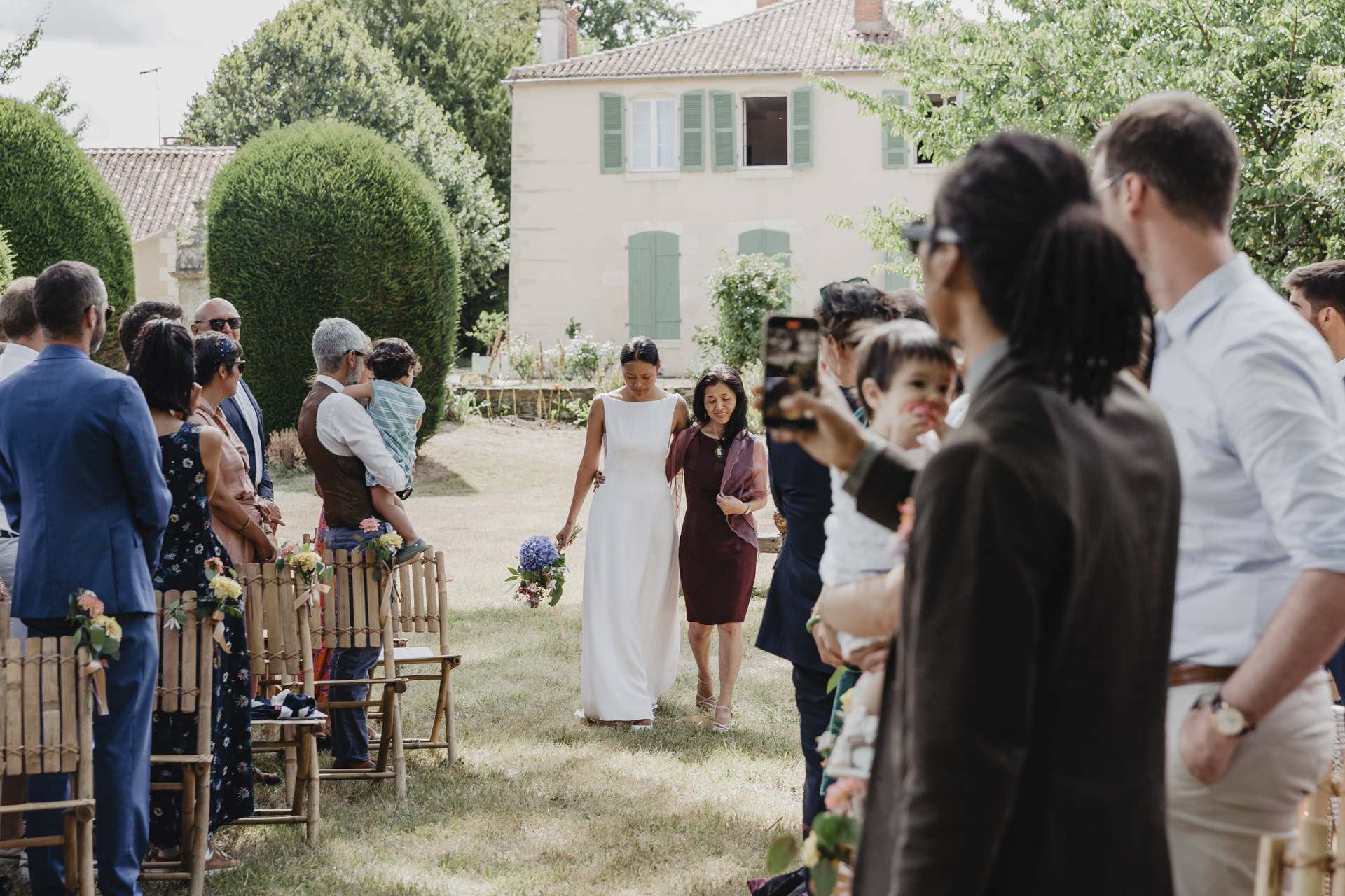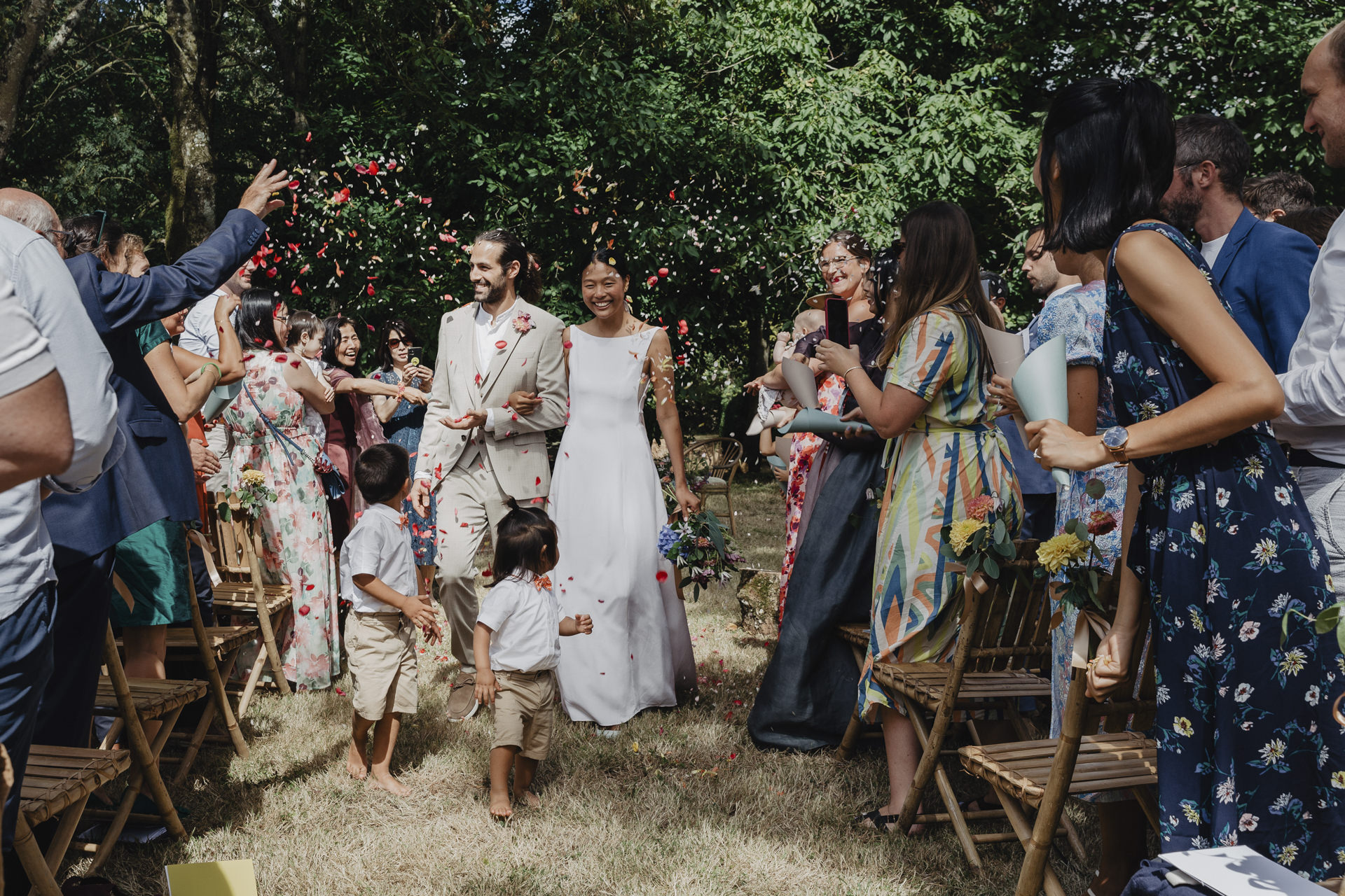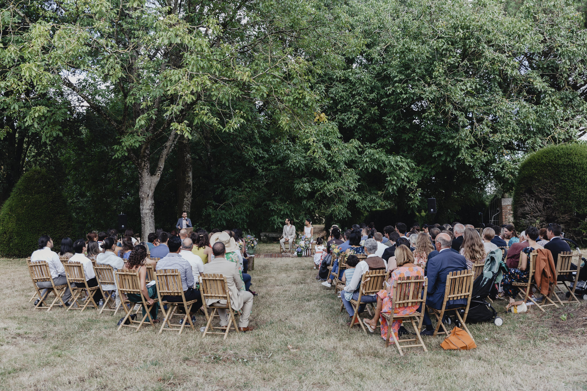 Au fond du jardin, sous un élégant chapiteau décoré de guirlandes, de fleurs et d’origamis personnalisés , des petits mains préparent les festivités du soir. Non loin de là, les invités se rassemblent avec des sourires éclatants. Des chaises en bambou alignées soigneusement, chacune ornée de petits bouquets de fleurs fraîches, offrent une vue parfaite sur l’autel improvisé.
