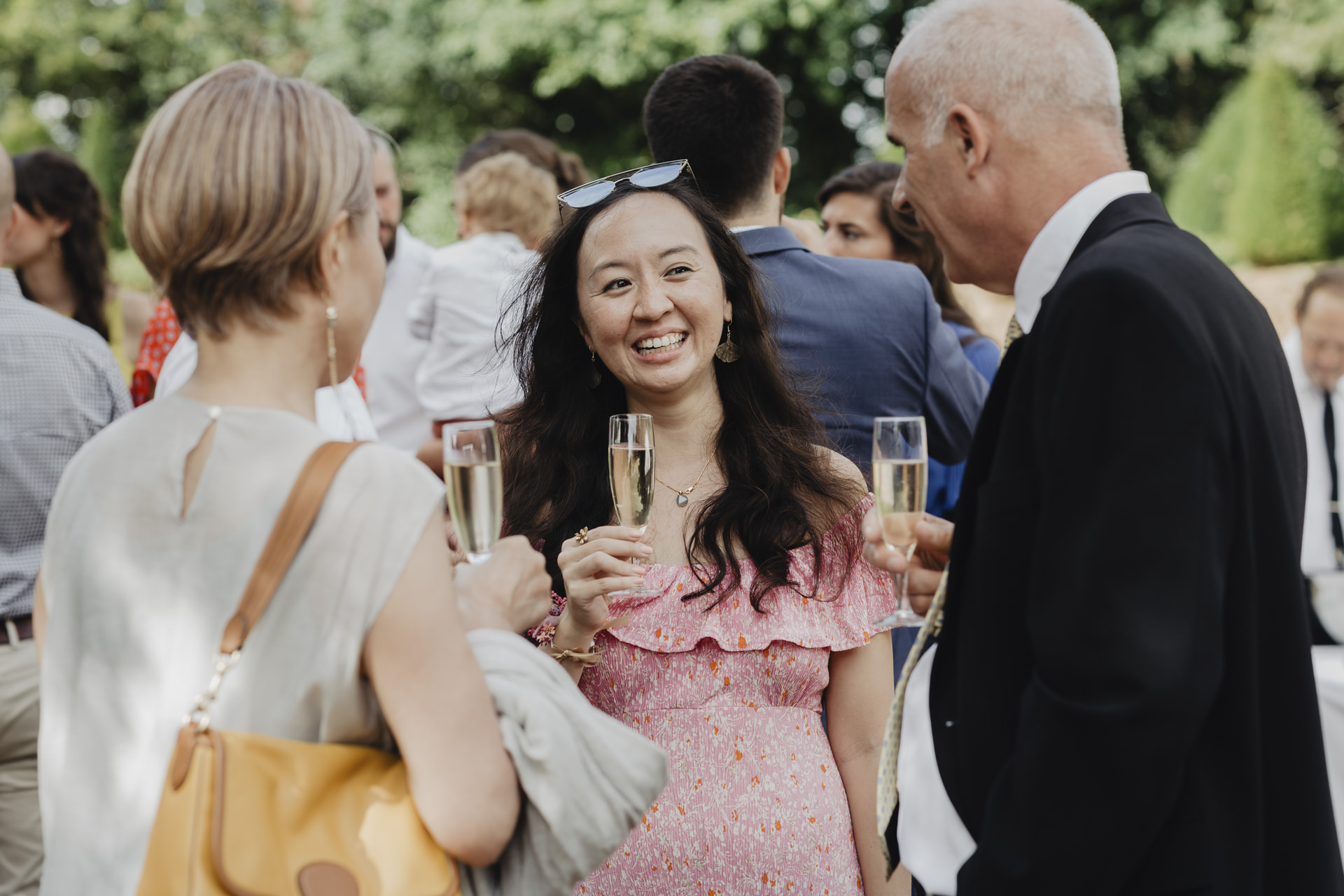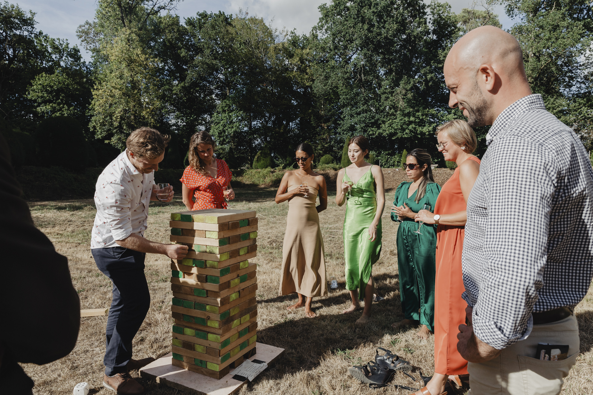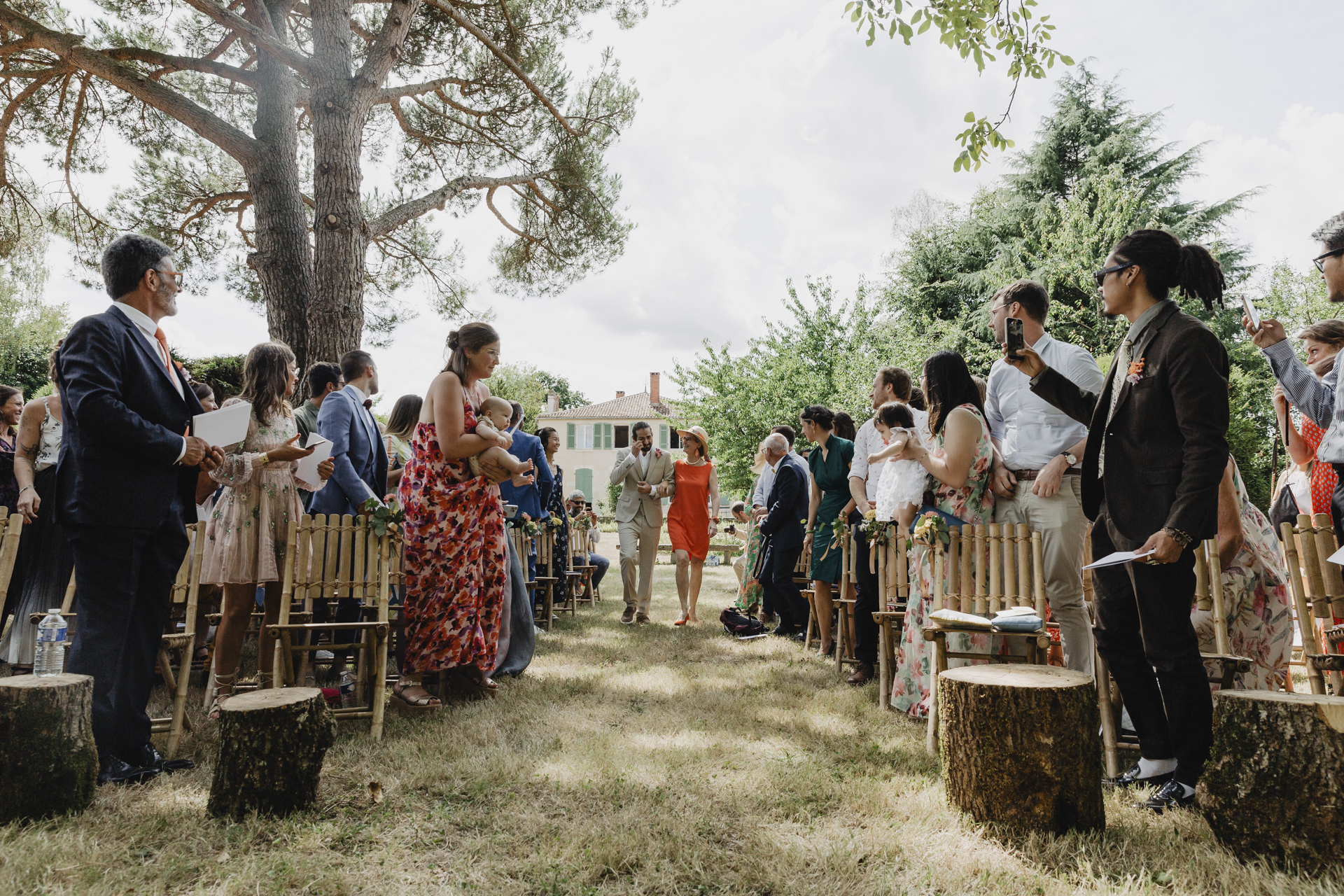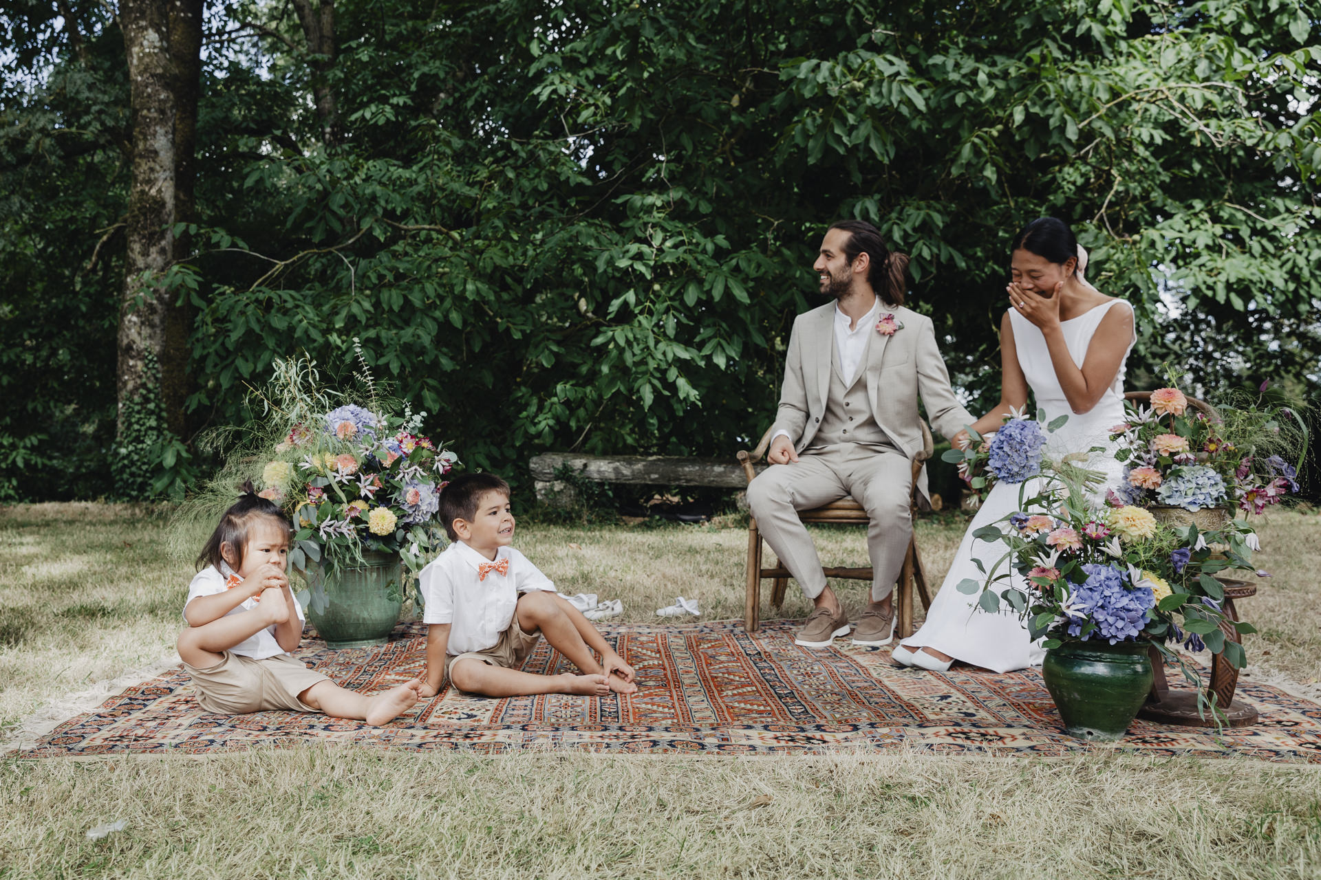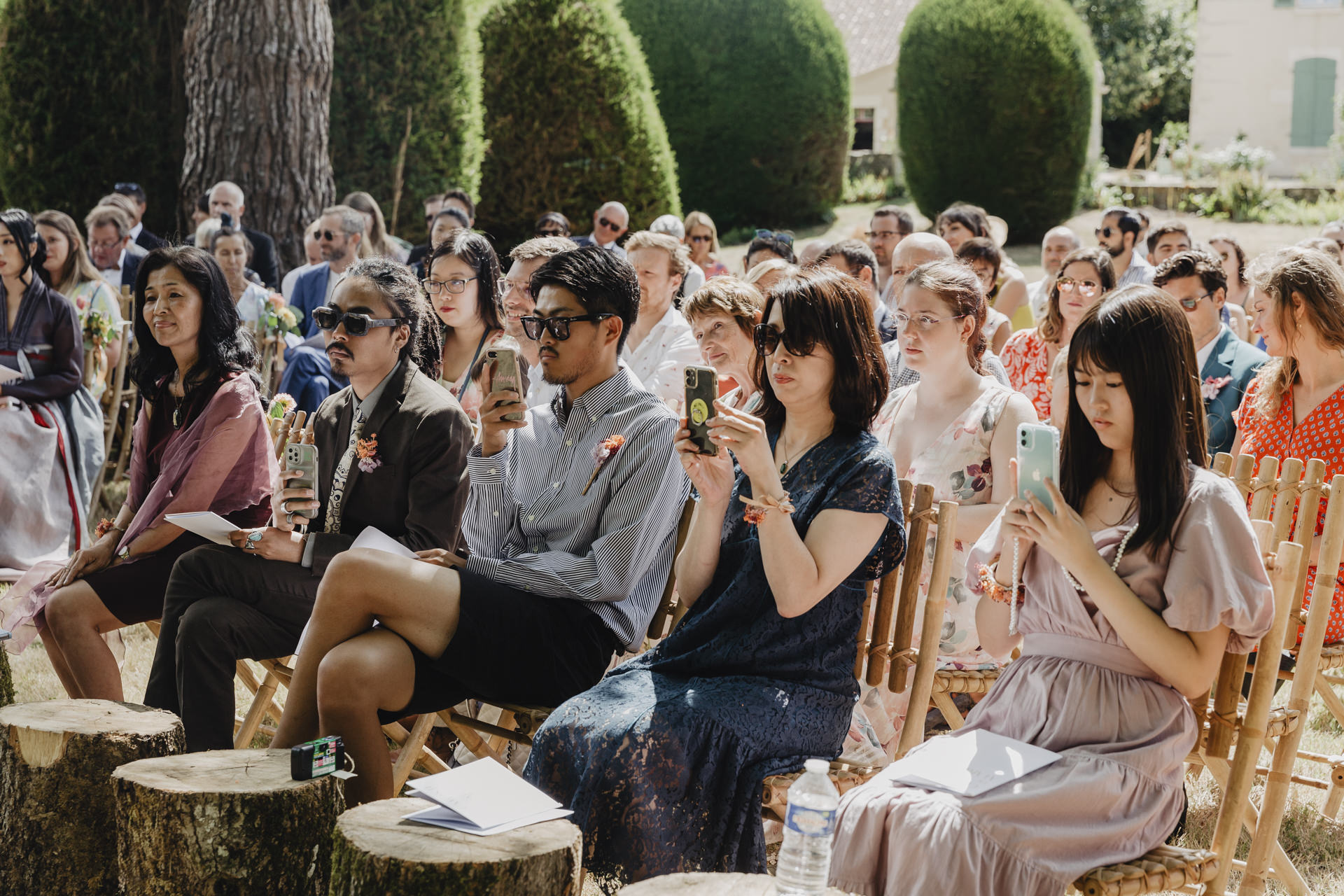 Au fond du jardin, sous un élégant chapiteau décoré de guirlandes, de fleurs et d’origamis personnalisés , des petits mains préparent les festivités du soir. Non loin de là, les invités se rassemblent avec des sourires éclatants. Des chaises en bambou alignées soigneusement, chacune ornée de petits bouquets de fleurs fraîches, offrent une vue parfaite sur l’autel improvisé.