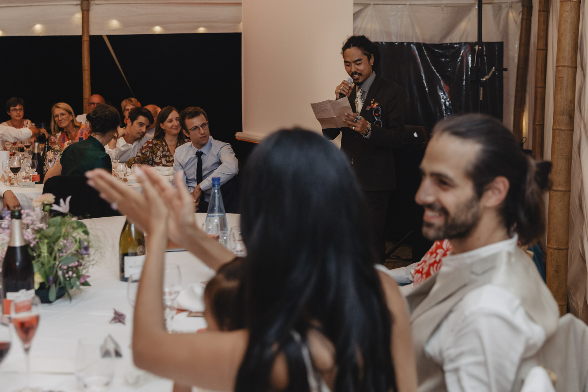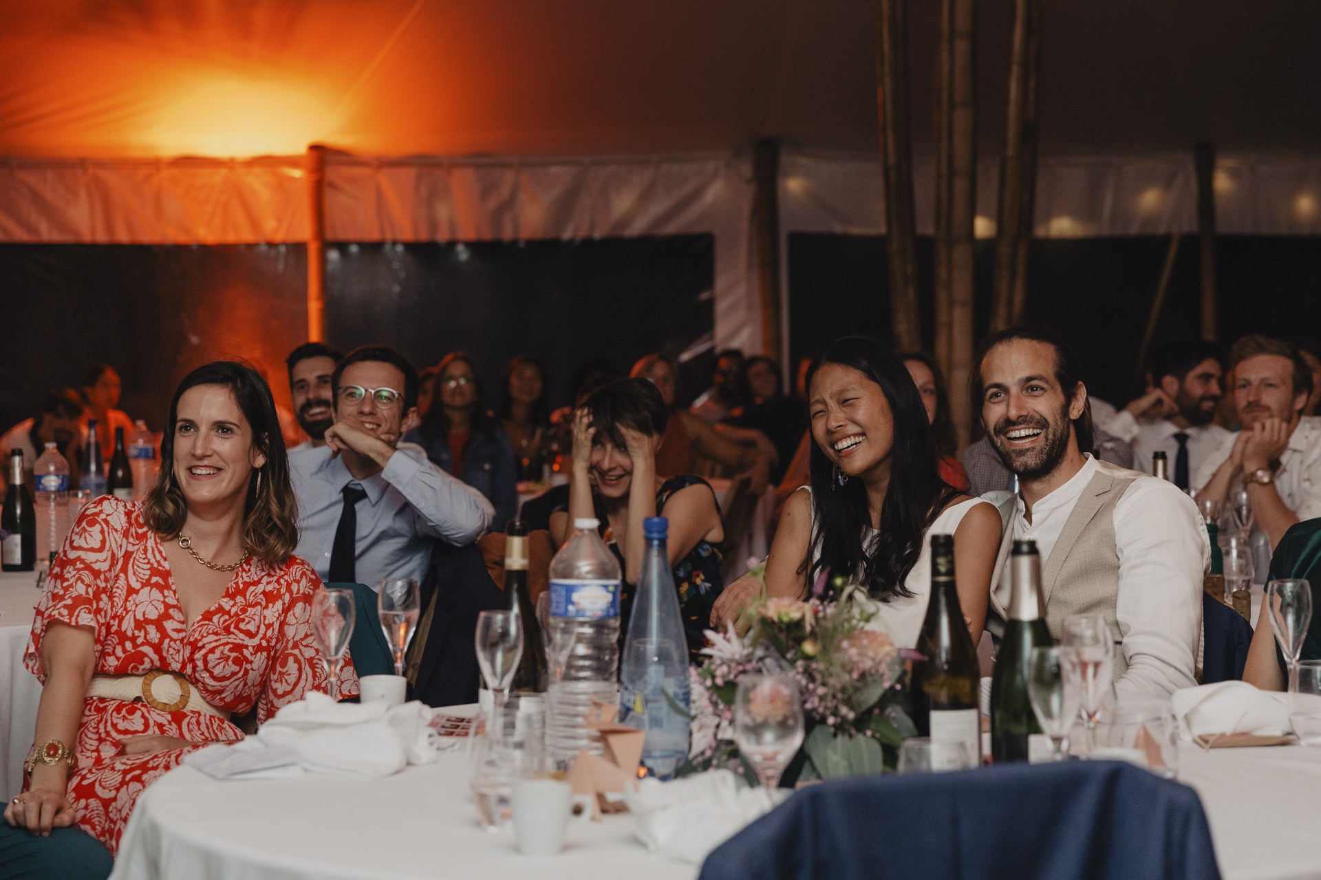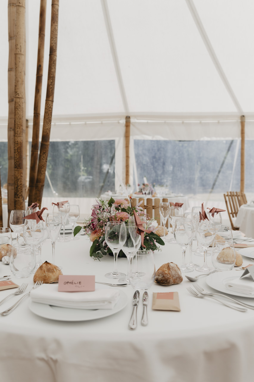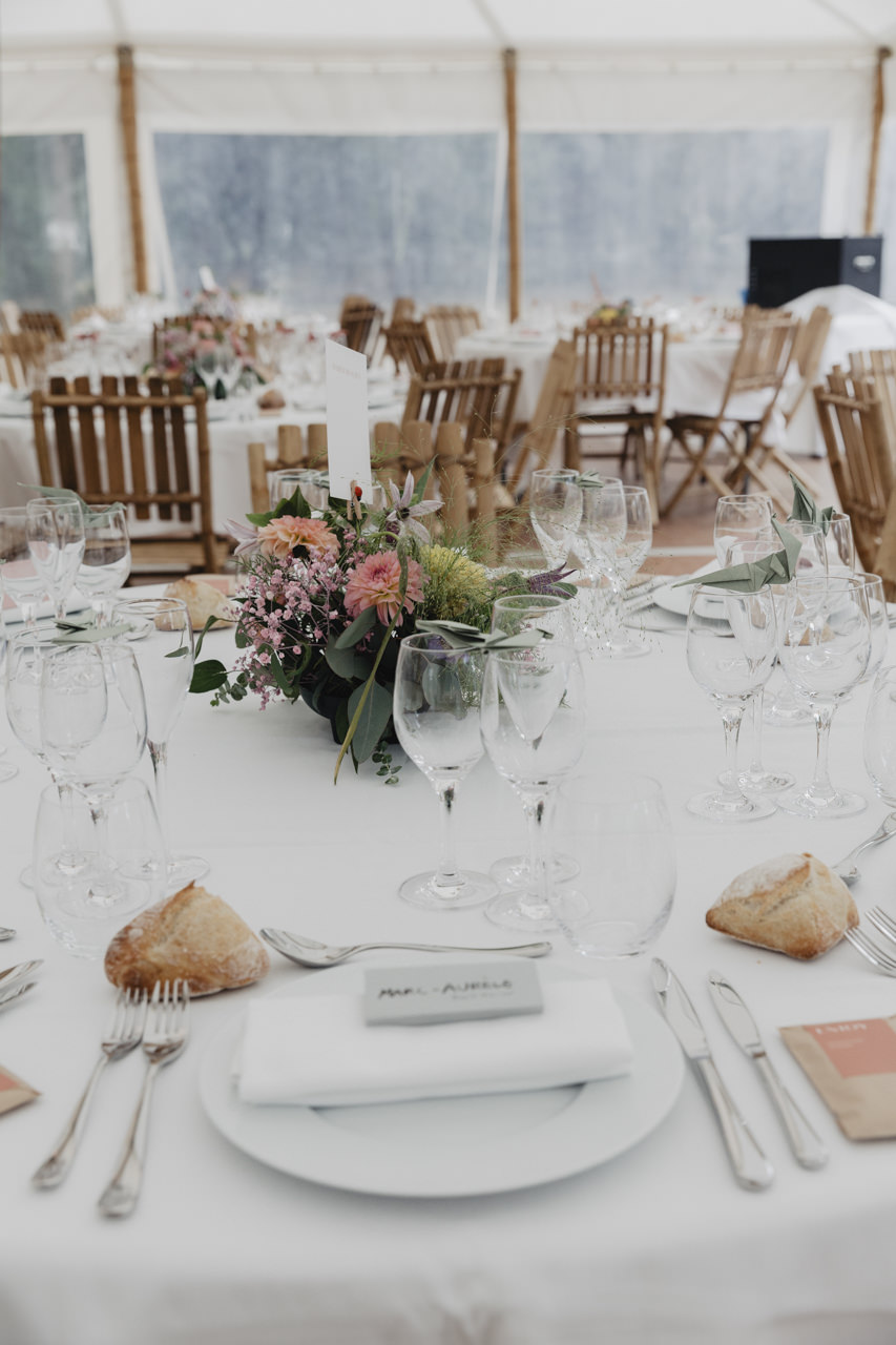 Après une fin d’après midi sous un soleil radieux, et un cocktail rempli de bonne humeur, nous nous dirigeons sous le chapiteau. Le repas offre une délicieuse sélection de plats gastronomiques et de délices culinaires. Les convives se régalent de mets exquis tout en échangeant des conversations joyeuses et en levant leurs verres pour célébrer le bonheur des nouveaux mariés.