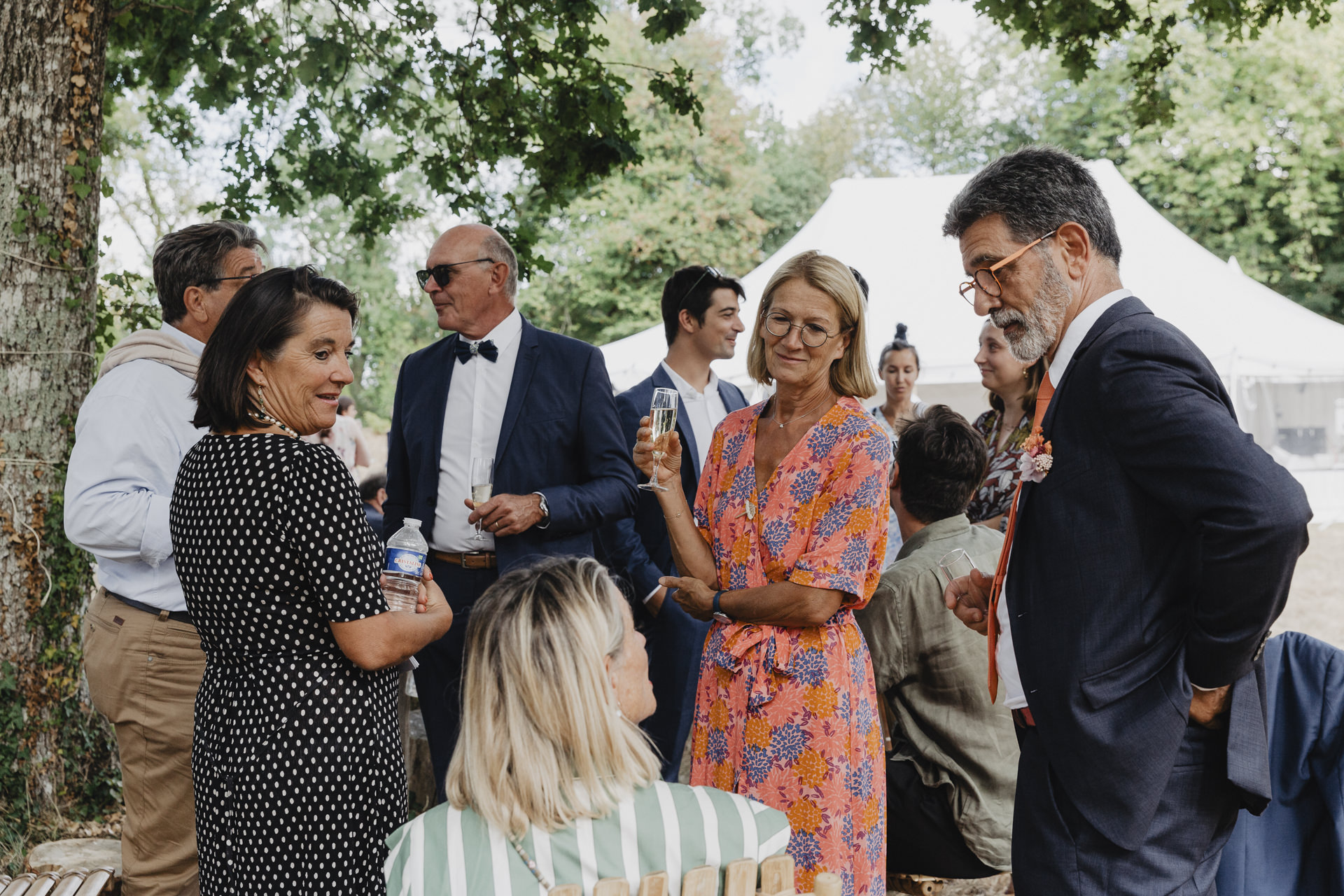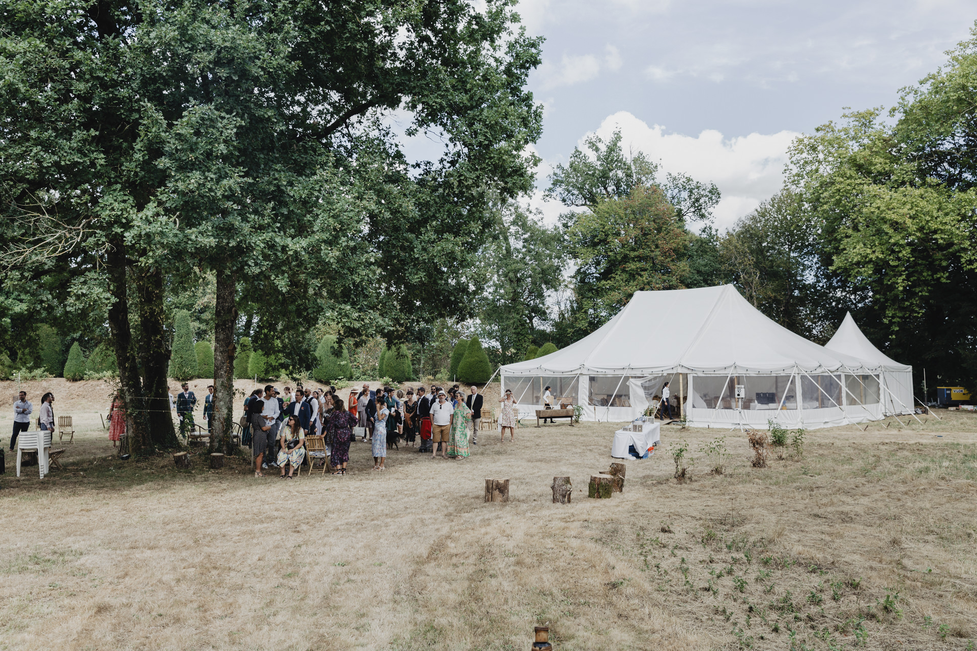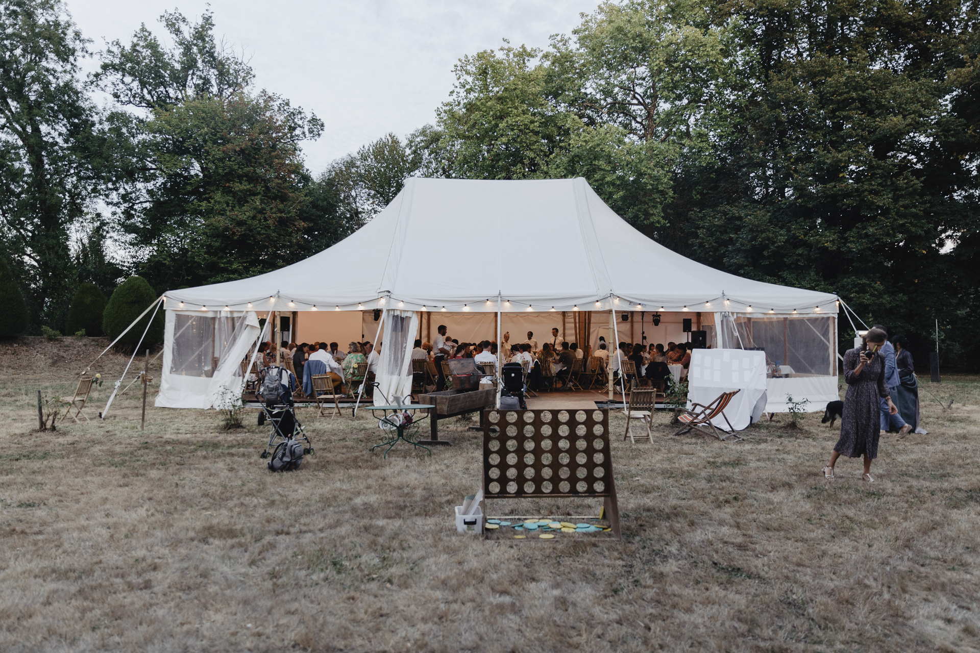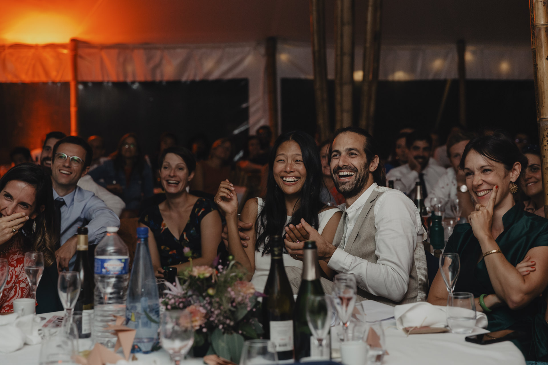 Après une fin d’après midi sous un soleil radieux, et un cocktail rempli de bonne humeur, nous nous dirigeons sous le chapiteau. Le repas offre une délicieuse sélection de plats gastronomiques et de délices culinaires. Les convives se régalent de mets exquis tout en échangeant des conversations joyeuses et en levant leurs verres pour célébrer le bonheur des nouveaux mariés.