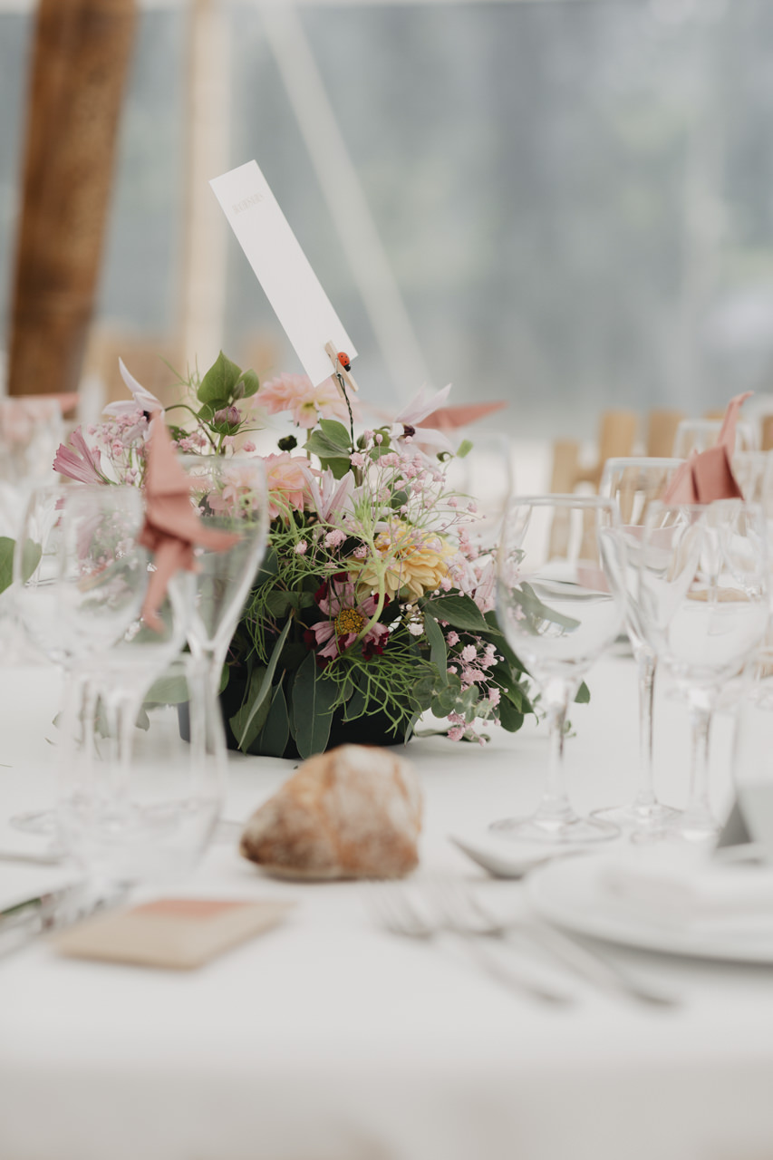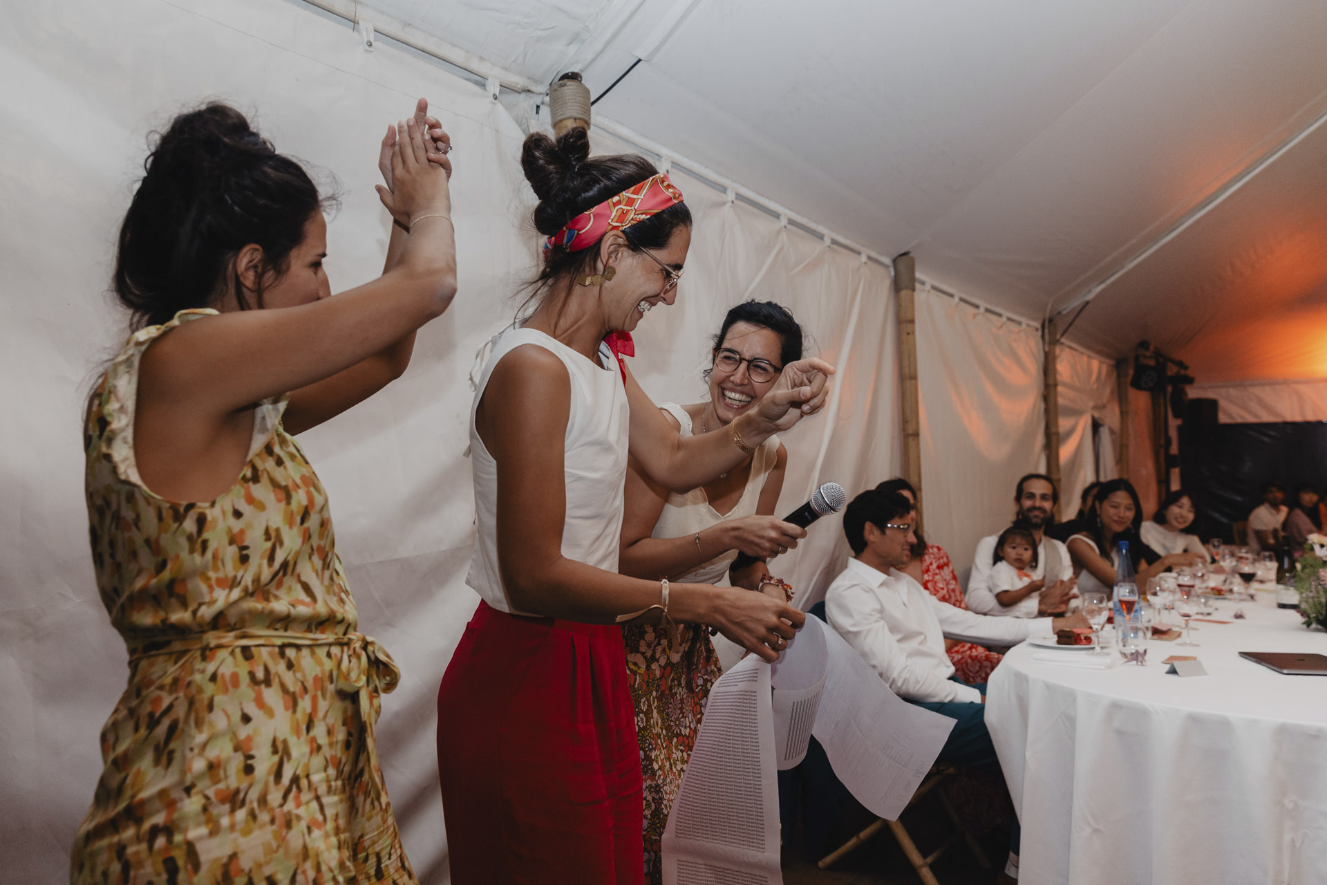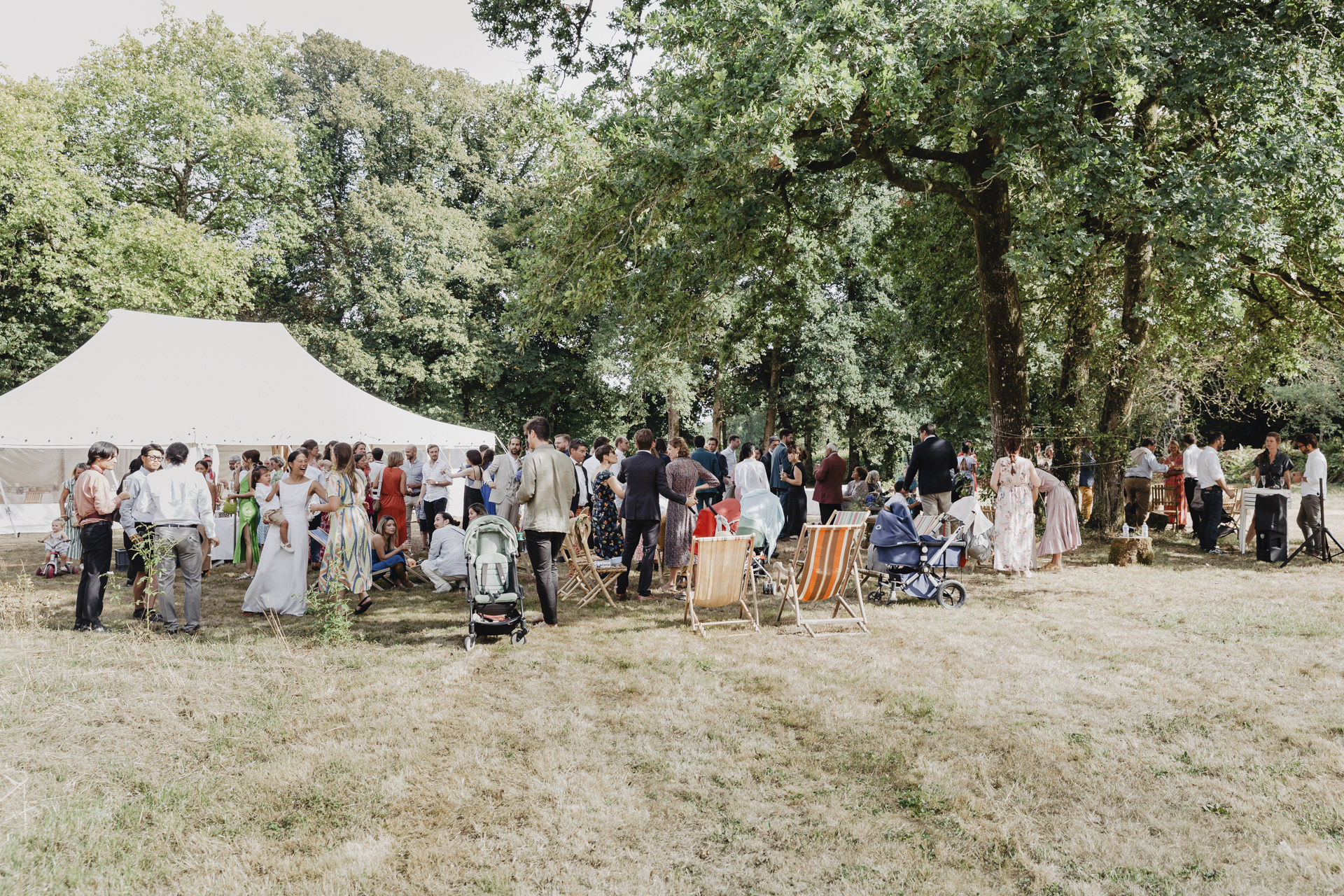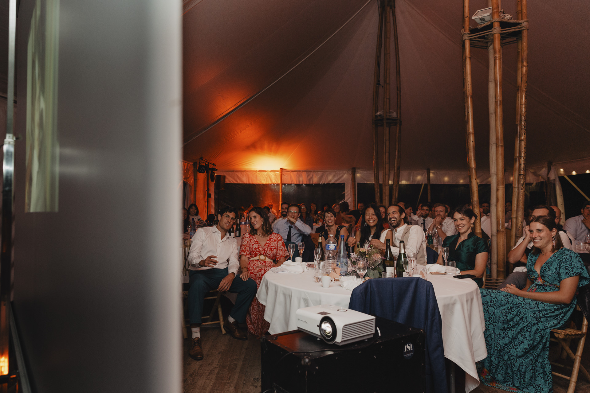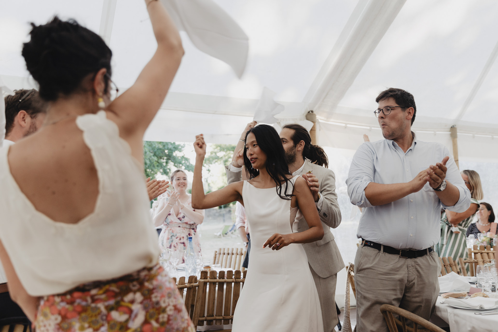 Après une fin d’après midi sous un soleil radieux, et un cocktail rempli de bonne humeur, nous nous dirigeons sous le chapiteau. Le repas offre une délicieuse sélection de plats gastronomiques et de délices culinaires. Les convives se régalent de mets exquis tout en échangeant des conversations joyeuses et en levant leurs verres pour célébrer le bonheur des nouveaux mariés.
