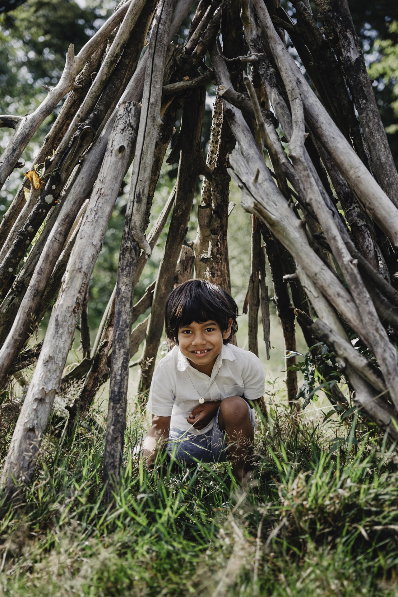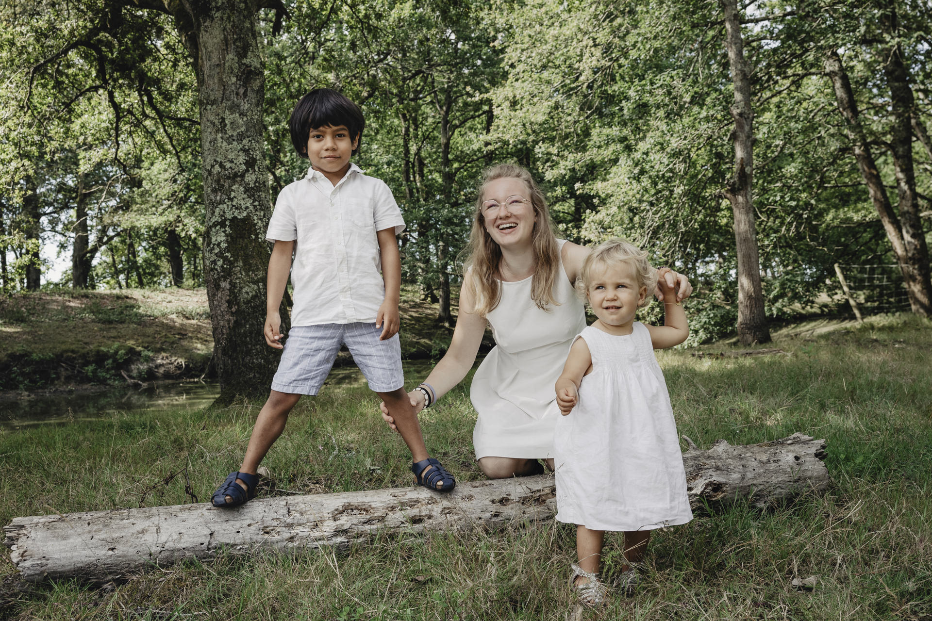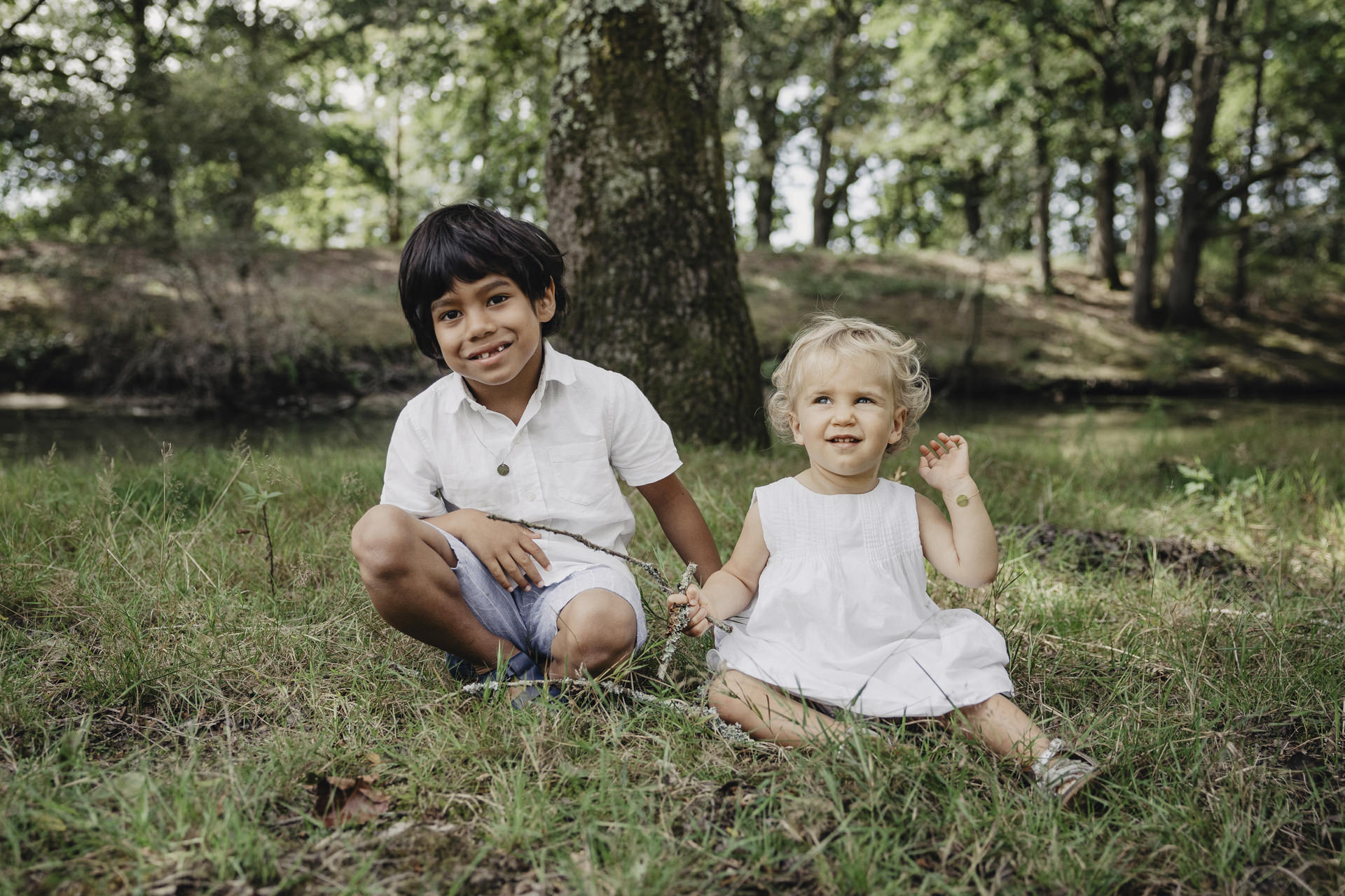 Cette fois-ci, le décor était très différent. La séance s’est déroulée directement chez eux, à leur domicile, sur leur propriété nichée au cœur des bois. Un véritable terrain de jeu à ciel ouvert, idéal pour une séance photos de famille près de Nantes à la fois chaleureuse et spontané. Grâce à cet environnement naturel, les enfants ont rapidement pris leurs marques. Ils ont couru, joué et exploré les alentours. Ainsi, l’objectif s’est vite fait oublier. C’est justement dans ces moments-là que naissent les images les plus simples.