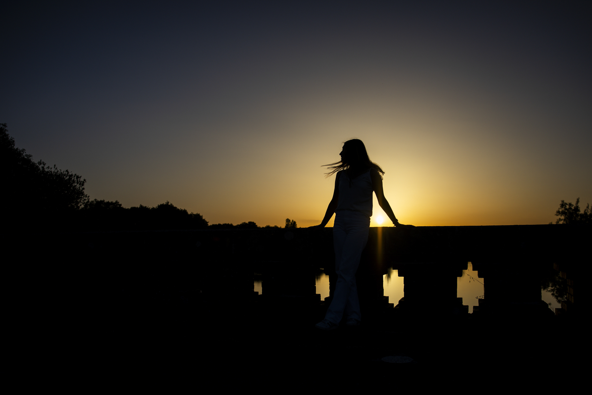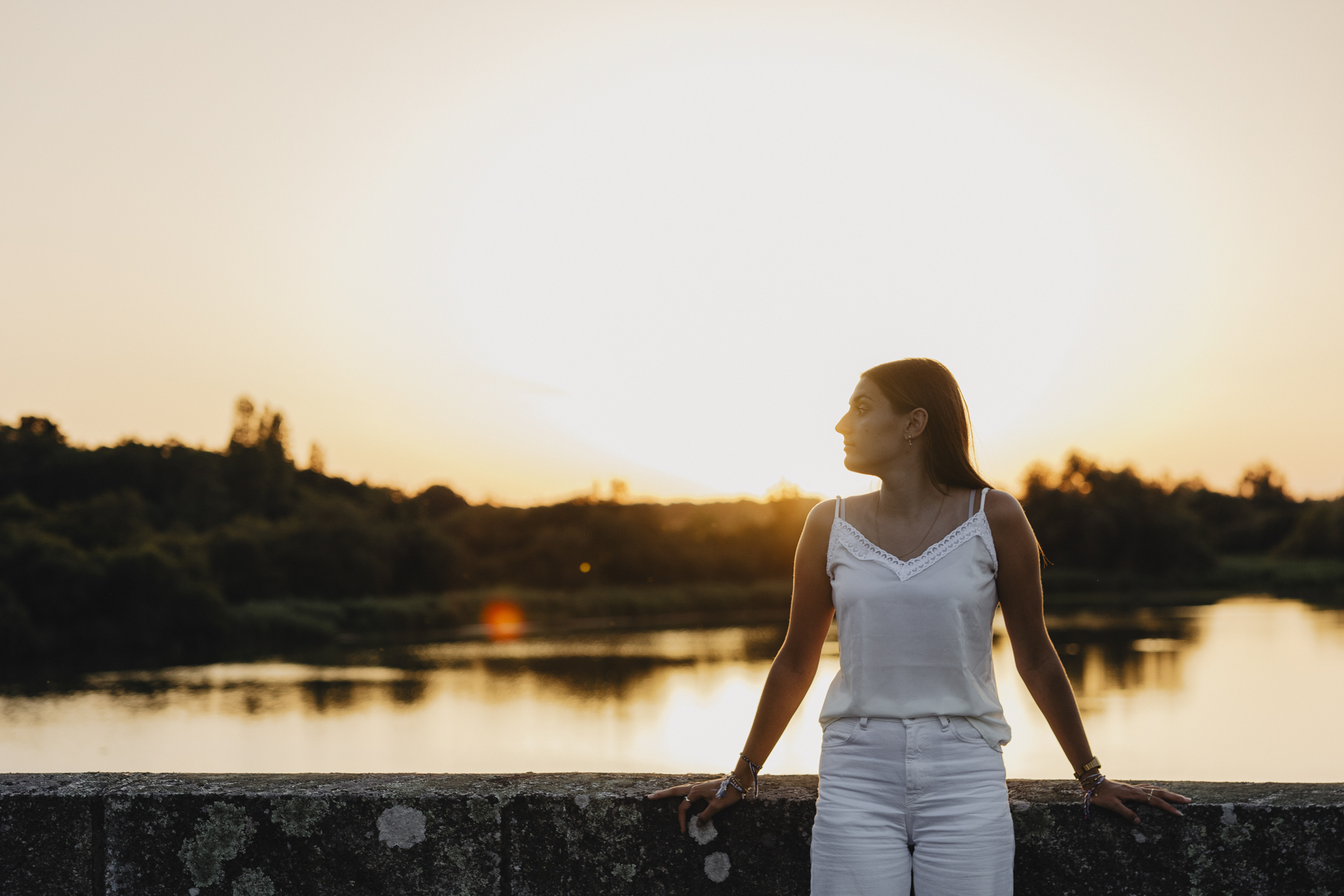 Après cette première partie de séance, nous avons rejoint un second lieu tout aussi magique : les abords du pont de l’Ouen. Ce spot offre un paysage dégagé, avec de l’eau, de l’espace et surtout une vue idéale pour admirer le soleil couchant. À ce moment précis de la journée, la lumière devient dorée, presque orangée, et enveloppe tout ce qu’elle touche.