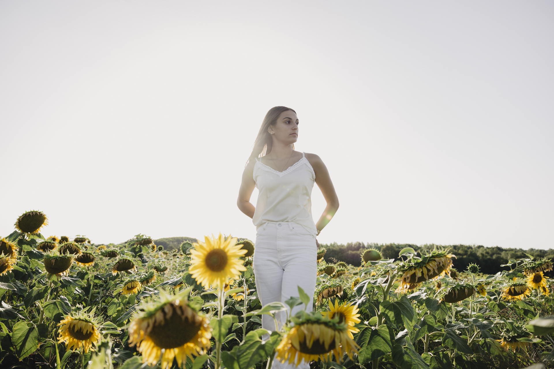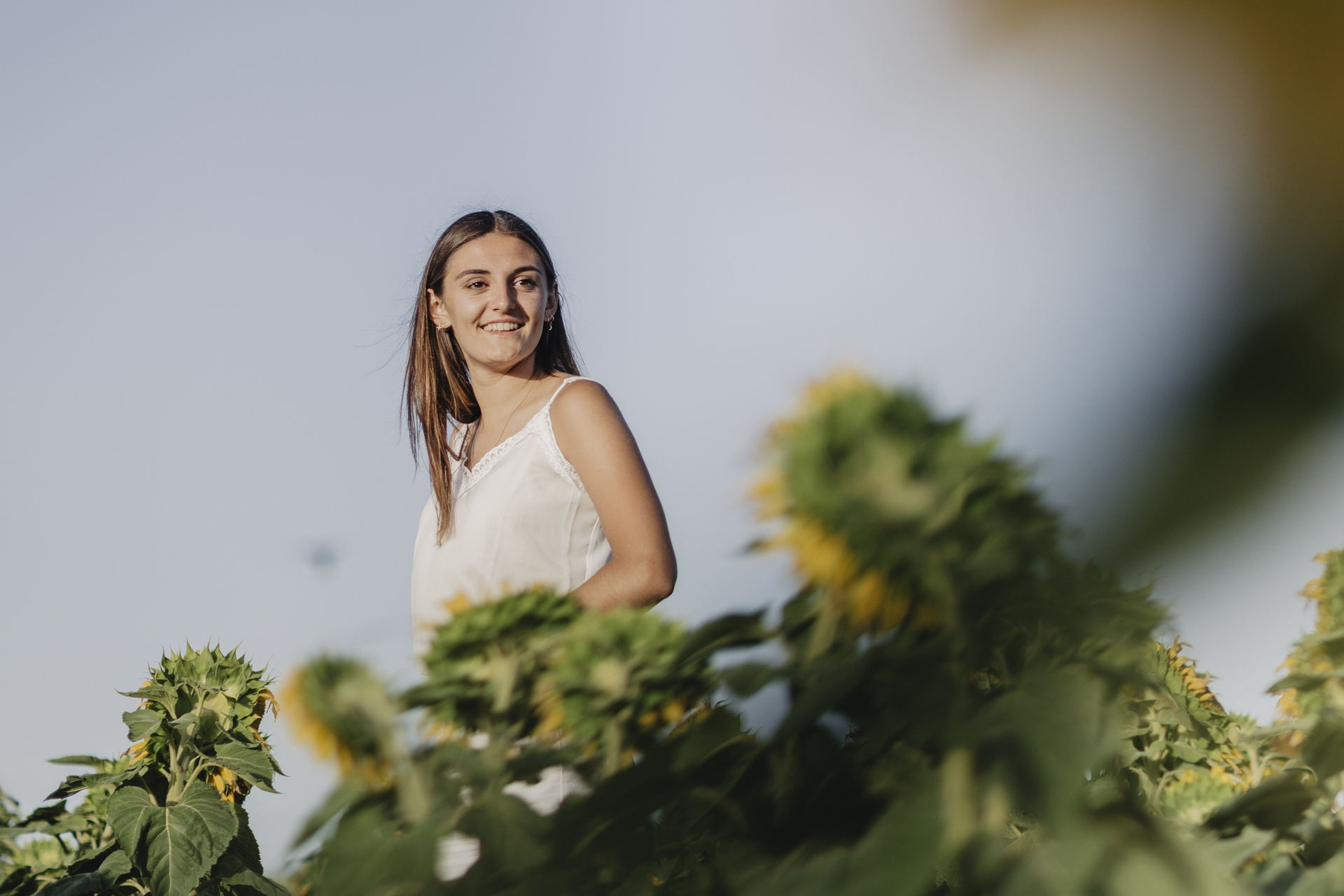 Notre première étape nous a menés dans un champ de tournesols. Un décor estival par excellence, lumineux et vivant. Les fleurs, tournées vers le soleil, apportaient une atmosphère joyeuse et naturelle. Ce type de lieu est parfait pour un shooting photos de portrait Nantes, car il permet de se sentir rapidement à l’aise, loin des décors figés.